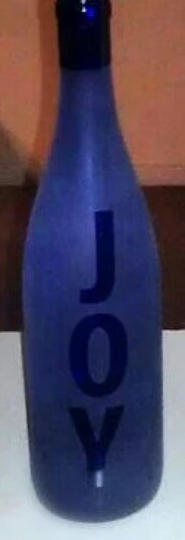 Wine bottle candle holder. Spray with a frost. Says Joy on the front